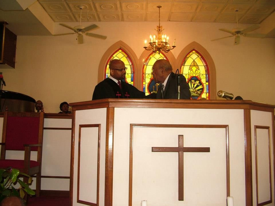 Pastor Smith conducts the pastoral handoff to Rev. Craddock.
